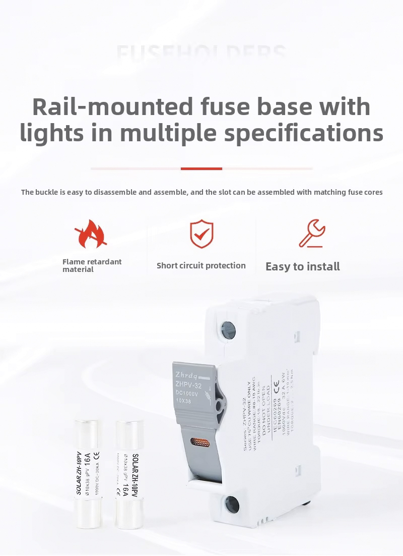 ZhengHao is a leading Chinese manufacturer specializing in the production of ZHPV-32 10X38 Cylindrical gG Fuse. The ZHPV-32 10X38 Cylindrical gG Fuses are specifically engineered to provide rapid protection against overload currents which are commonly encountered in industrial applications. Featuring a compact 10x38mm fuse link size, the ZHPV-32 10X38 Cylindrical gG Fuses are ideally suited for safeguarding general industrial circuits operating at voltages up to 1000V, including motors, transformers, low voltage distribution, and control circuits. The recommended fuse holder for the ZHPV-32 10x38mm cylindrical gG fuses are the ZHPV-32 10x38mm fuse holder, which boasts a flame-retardant shell which meets V0 standards and features a dead-front design for enhanced finger-safe. Moreover, the ZHPV-32 10X38 Cylindrical gG Fuse offer the convenience of bus-bar mounting compatibility, and are available in various configurations (1P/2P/3P/4P) to cater to diverse installation requirements.
