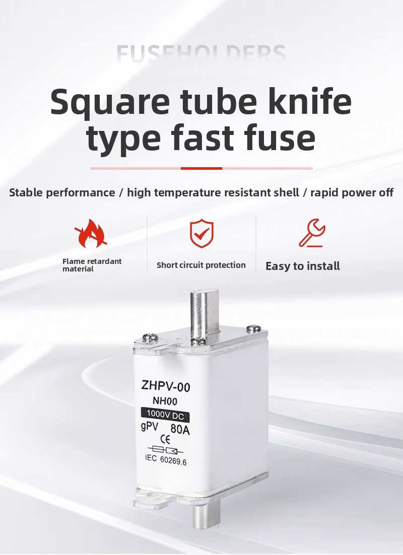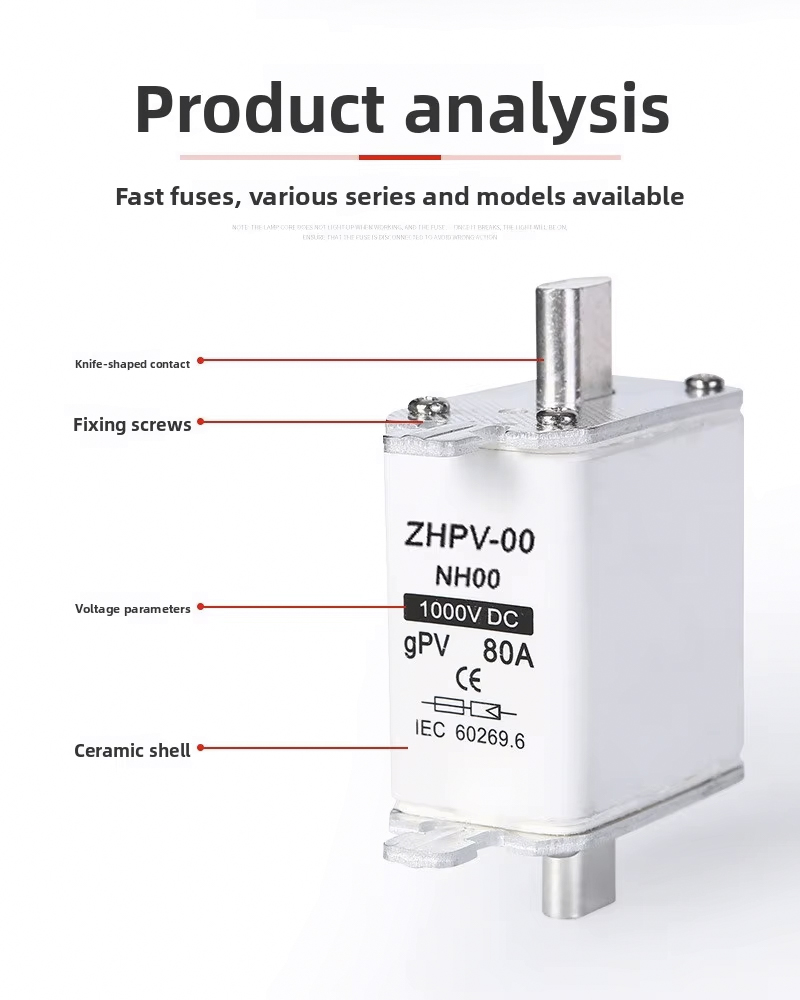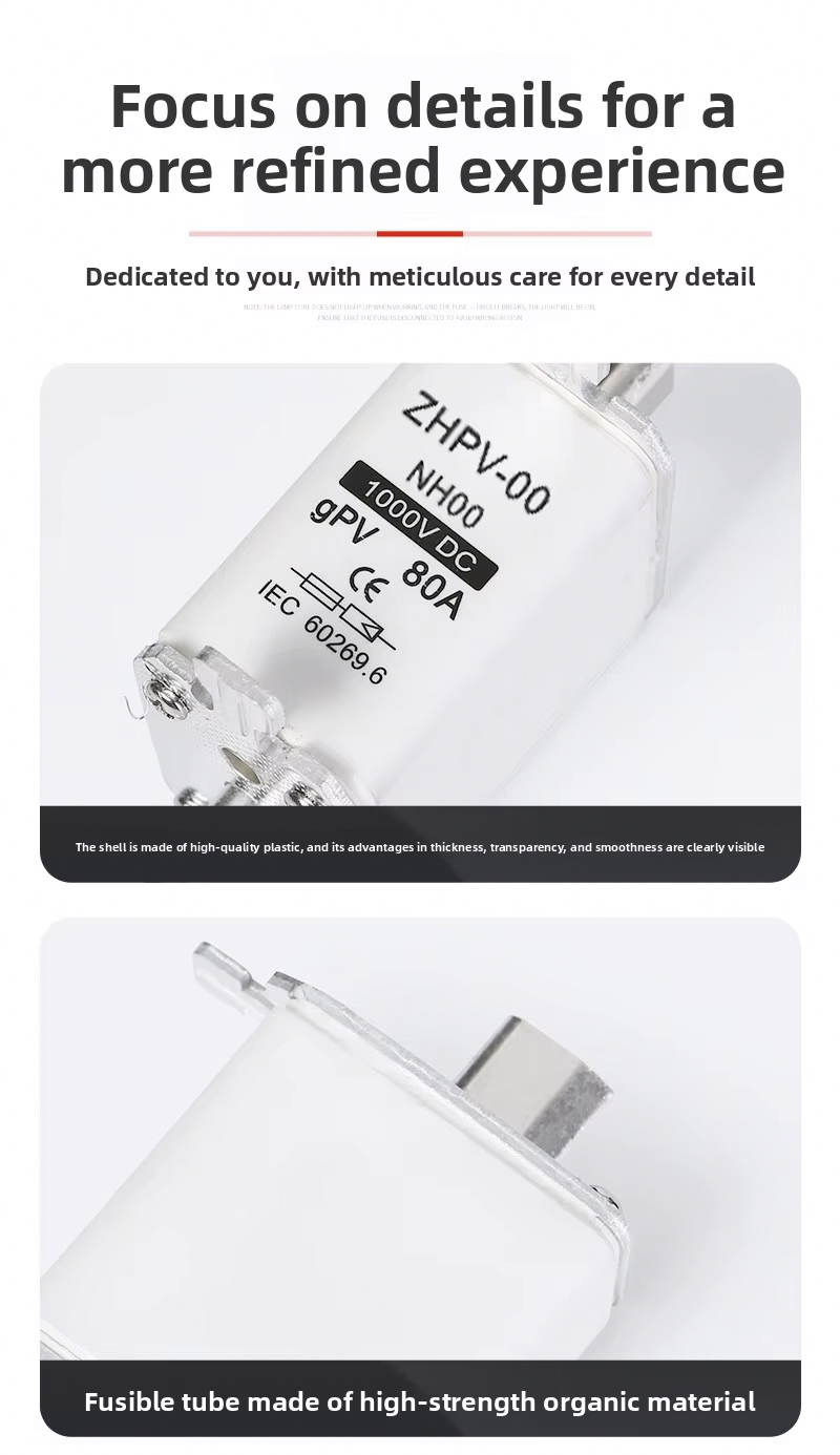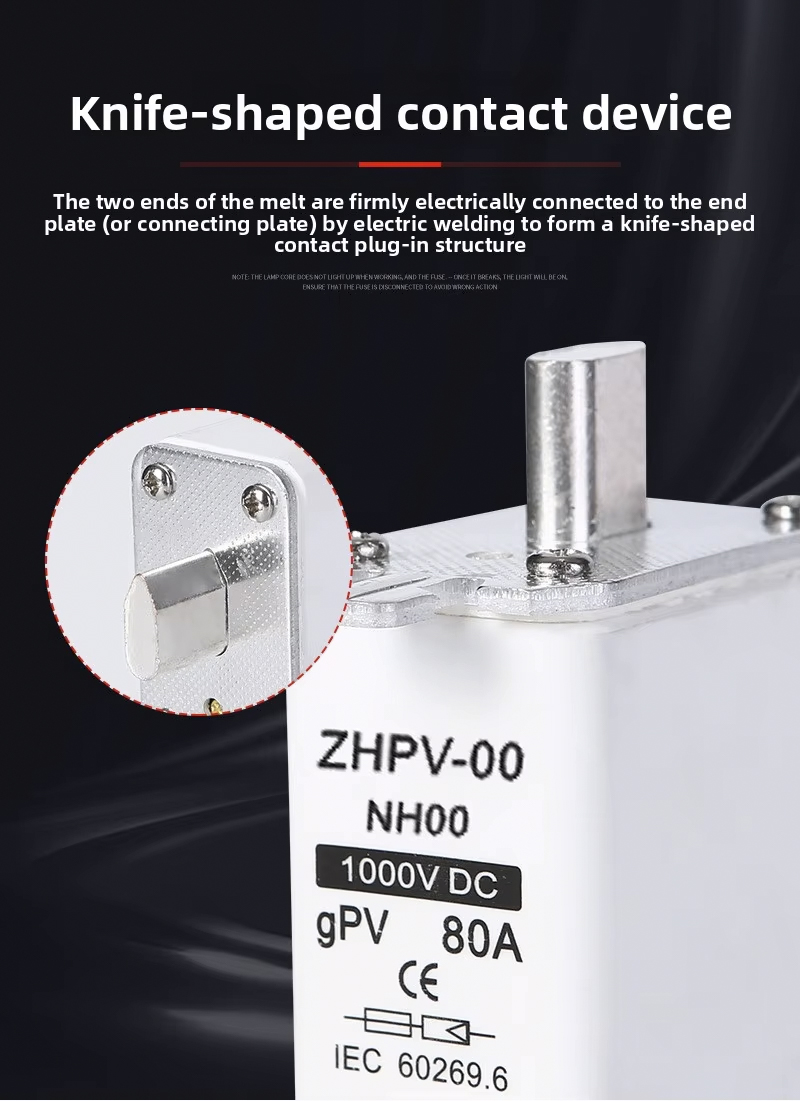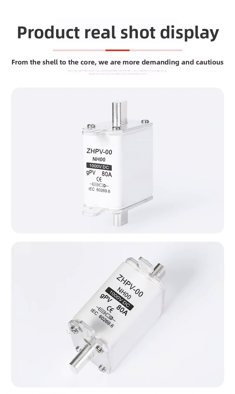 Crafted from durable plastic, the NH00-1000V IEC Low Voltage Photovoltaic Knife Fuse Plastic 80A 6ka Breaking Capacity offers excellent insulation and heat resistance, ensuring stable performance in demanding environments. Compliant with IEC standards, this fuse guarantees safety and meets the requirements for modern renewable energy projects. The knife-type design allows for easy installation and replacement, reducing maintenance time and ensuring continuous system operation.Choose the NH00-1000V IEC Low Voltage Photovoltaic Knife Fuse Plastic 80A 6ka Breaking Capacity for your solar or industrial application to benefit from exceptional protection, durability, and compliance with international safety standards.
