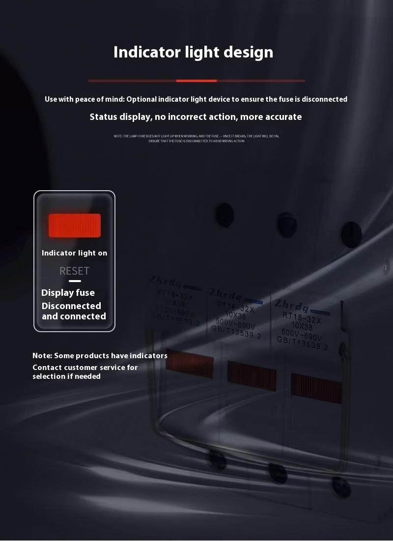 During normal operation, current flows through the melt, and the heat generated by the melt is not sufficient to cause it to melt; When the circuit is overloaded or short circuited, excessive current passes through the melt, and the heat generated by it causes the melt to melt (the melt material is low melting point lead tin alloy or high melting point copper, silver, etc., and the melting characteristics are controlled by narrow neck or mesh structure design), thereby cutting off the circuit. Some fuse links are also equipped with a melting indicator, which pops up a red signal after the melt melts, making it easy to troubleshoot. The 3P model is suitable for three-phase circuits and can protect three-phase lines at the same time.