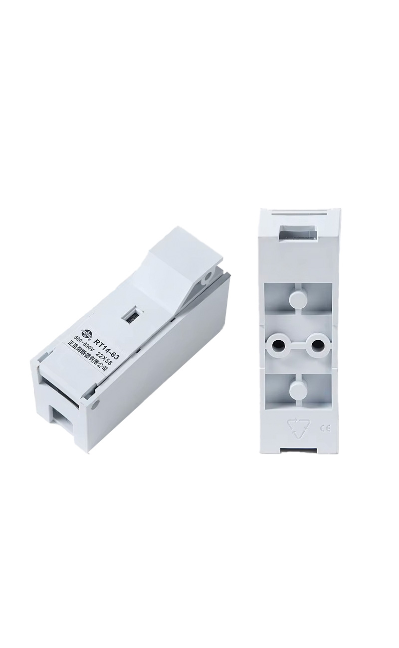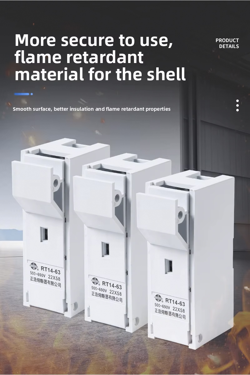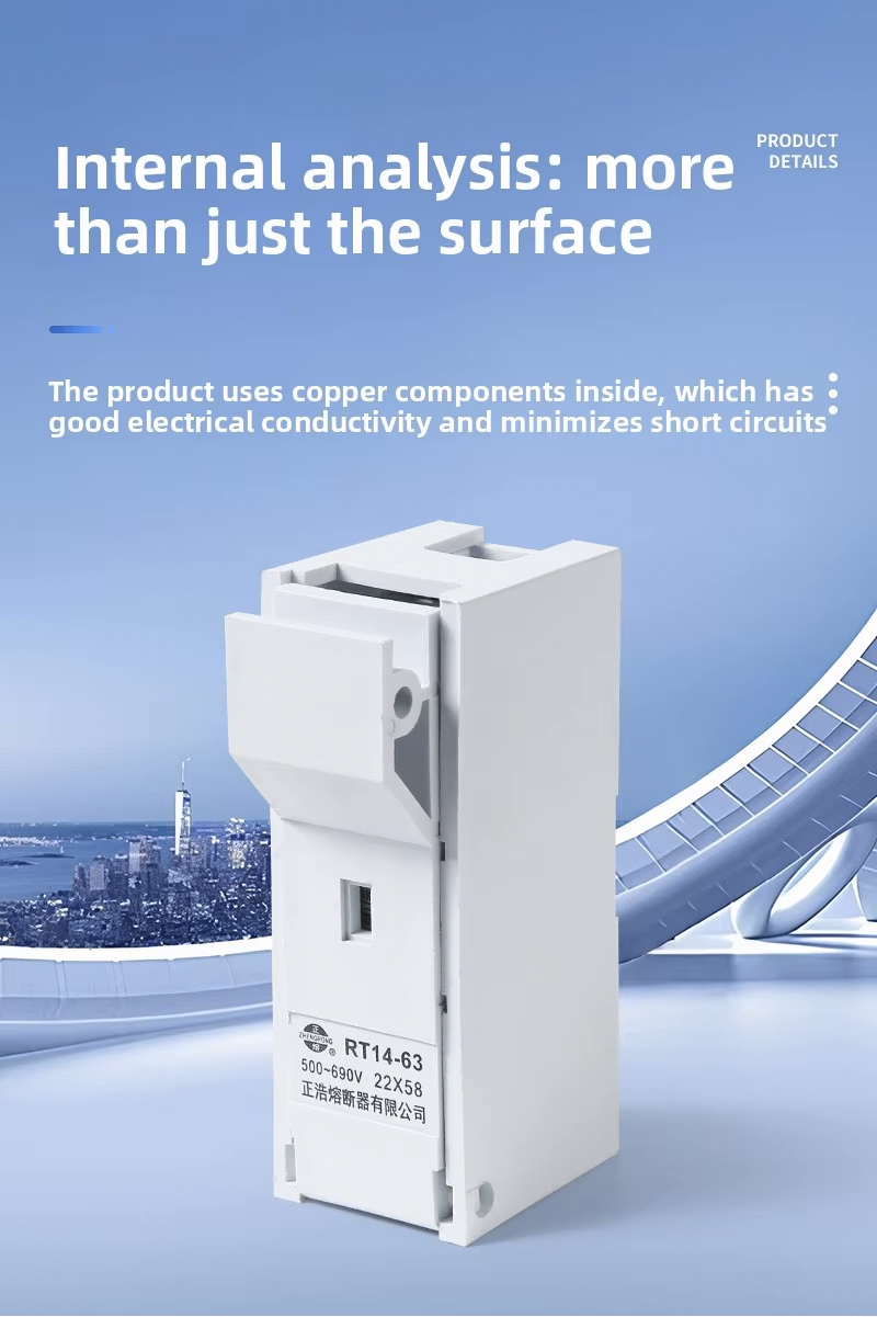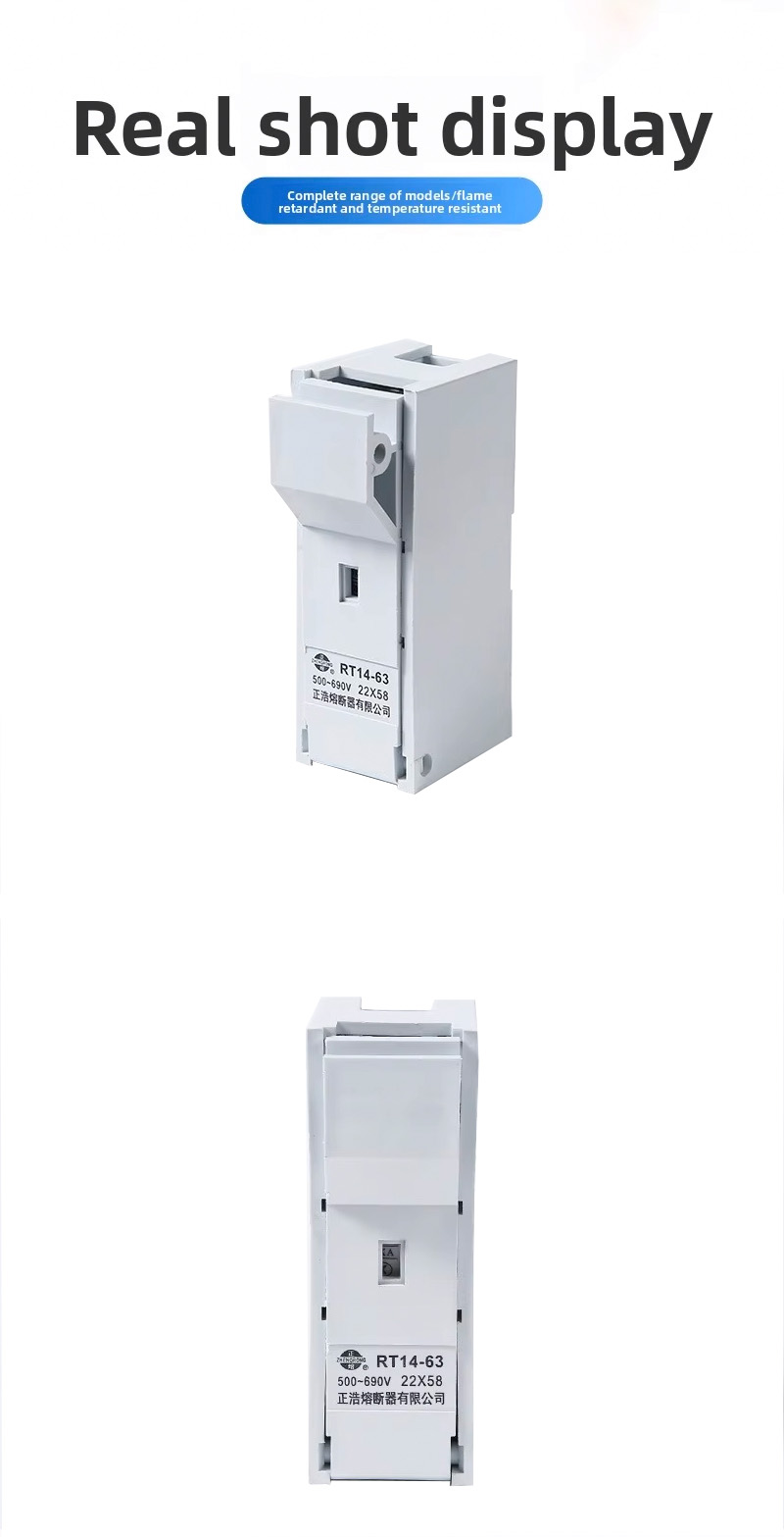 The product is RT14-63 with a rated voltage of 500V~690V and a rated current of 100V. The passing current is 63A, and the rated breaking force of the fuse of this series is 25KA, which conforms to the national standard GB13539 and the international electrotechnical standard IEC60269.